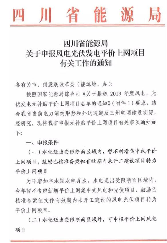 近日,四川省能源局下發《關于申報風電光伏發電平價上網項目有關工作的通知》,指出水電送出受限斷面區域內,暫不新增集中式平價上網項目,鼓勵已核準備案但有效期內未開工建設項目轉為平價上網項目。