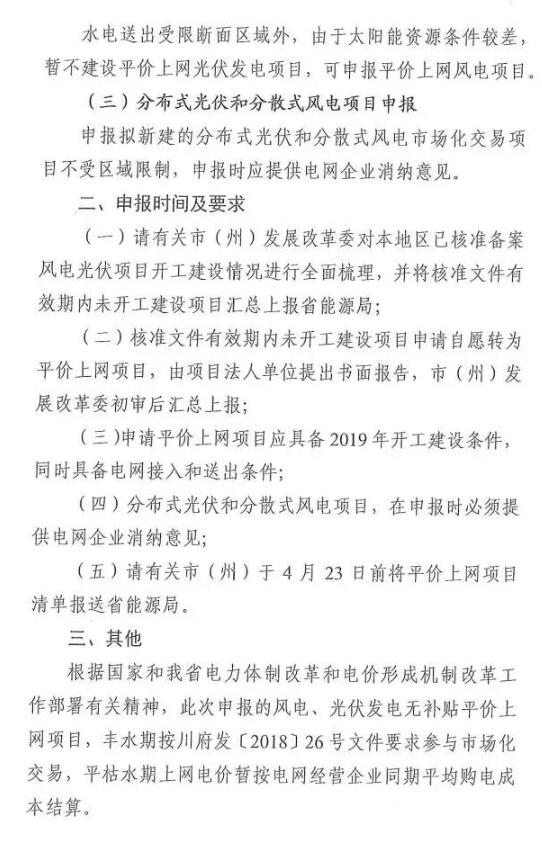 近日,四川省能源局下發《關于申報風電光伏發電平價上網項目有關工作的通知》,指出水電送出受限斷面區域內,暫不新增集中式平價上網項目,鼓勵已核準備案但有效期內未開工建設項目轉為平價上網項目。水電送出受限斷面區域外,由于太陽能資源條件較差,暫不建設平價上網光伏發電項目。擬新建的分布式光伏市場化交易項目不受區域限制,但申報時需提供電網企業消納意見。