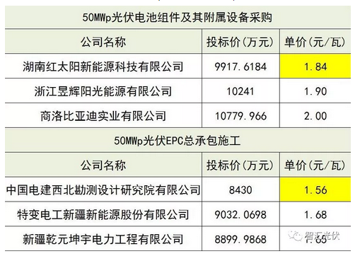 該項目對組件、EPC(含逆變器)、工程監理進行分別招標,中標結果分別為:1.84元/W、1.56元/W、0.01元/W,合計為3.41元/W。
