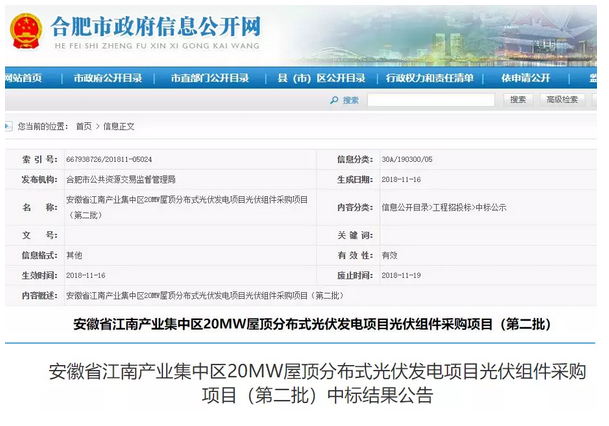 2018年11月19日,合肥市公共資源交易監督管理局發布安徽省江南產業集中區20MW屋頂分布式光伏發電項目光伏組件采購項目(第二批)中標結果公告。公告顯示,光伏組件中標價格為:1.485元/W。