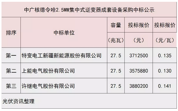 2018年6月,中廣核公司發布《中廣核新能源青海德令哈太陽能領跑者項目2.5MW集中式逆變器成套設備采購中標公示》,根據招標文件及中標公示,整理了下面的表格供參考: