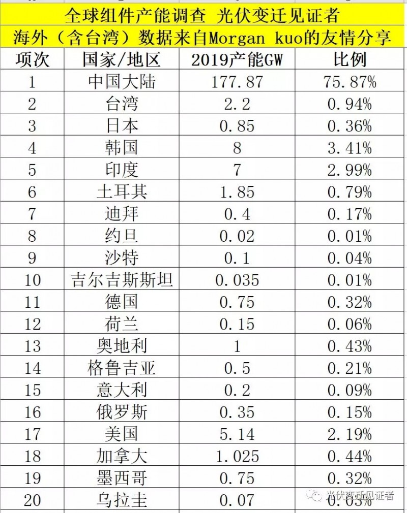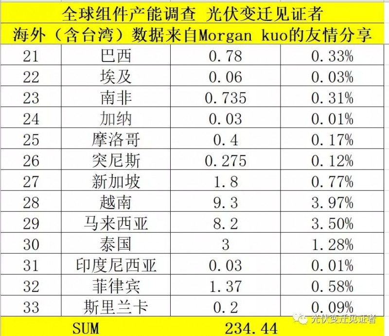 全球組件產能累計234.44GW,中國大陸組件產能一騎絕塵。