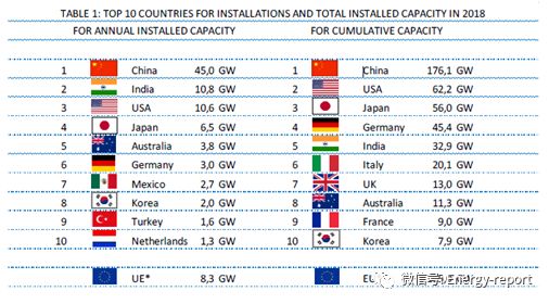 除了一些國家的排名發生了變化外,前五名與2017年非常相似。此外,2018年的主要發展是其他幾個排在前五名之后的國家的增長:澳大利亞裝機容量為3.8 GW,墨西哥為2.7 GW,韓國為2.0 GW。土耳其緊隨其后,在不斷下滑的市場中獲得了1.6 GW的裝機容量。再深入研究一下歐盟國家,德國經歷了自2013年以來最好的一年,裝機容量約為3.0 GW,荷蘭進入前10名,裝機容量為1.3 GW。