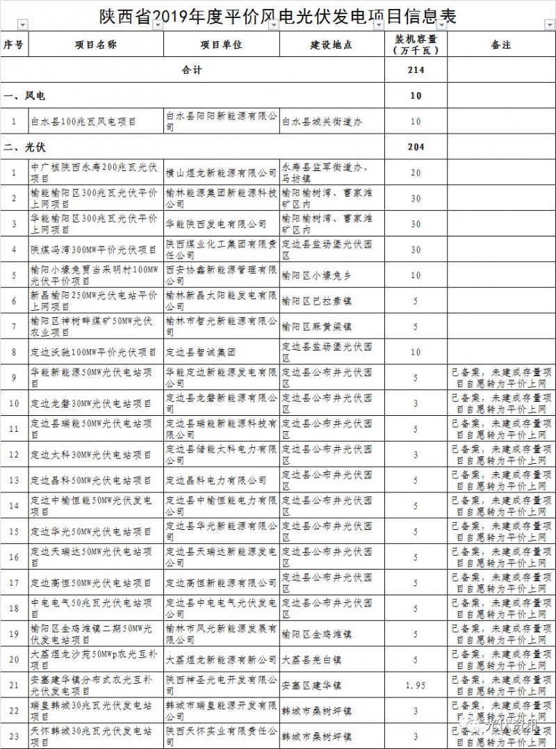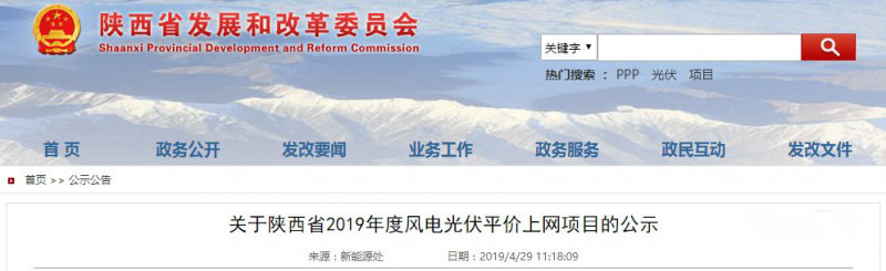 關于陜西省2019年度風電光伏平價上網項目的公示