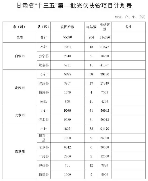 4月12日下發(fā)的1.673GW“十三五”第二批光伏扶貧項目,分配給甘肅314MW、寧夏19MW。如下表所示。近日,甘肅、寧夏兩省下發(fā)了333MW扶貧指標(biāo)具體分配情況。