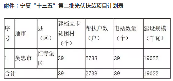 2018年7月,自治區(qū)扶貧辦 自治區(qū)發(fā)展改革委以《關(guān)于將紅寺堡區(qū)村級光伏扶貧電站項目納入“十三五”第二批光伏扶貧計劃的請示》向國家上報了紅寺堡區(qū)光伏扶貧村級電站項目。本次國家能源局、國務(wù)扶貧辦下達(dá)我區(qū)1個縣光伏扶貧項目,共39個村級光伏扶貧電站(以下簡稱電站),總裝機(jī)規(guī)模19022千瓦,幫扶對象為39個建檔立卡貧困村的2738戶建檔立卡貧困戶(詳見附件)。