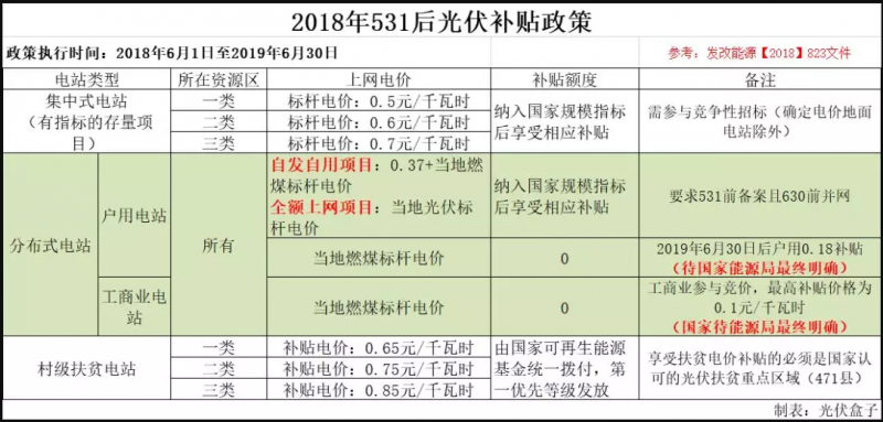 首先,可以先看看2018年531至2019年12月31日光伏補貼政策情況,戶用光伏電站的上網電價情況已經用加深的顏色標注出來了。