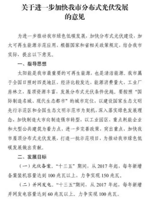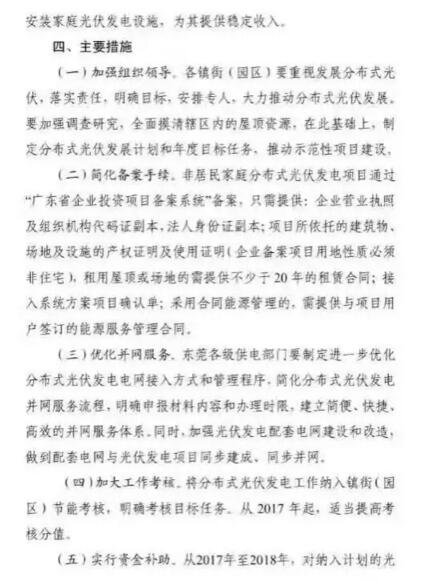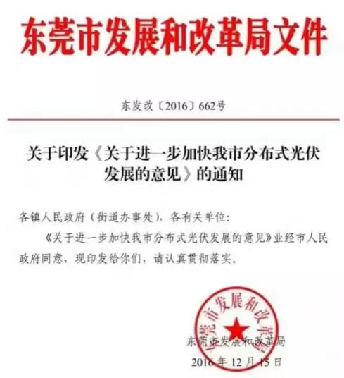 東莞發(fā)改于2016年12月15日印發(fā)《關(guān)于進(jìn)一步加快我市分布式光伏發(fā)展意見》的通知,為“十三五”期間光伏發(fā)展指定規(guī)劃,目標(biāo)力爭(zhēng)自2017年起每年新增150MW光伏裝機(jī)備案,并提出以下要求: