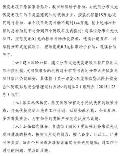 2017年至2018年,東莞?jìng)浒覆⑼瓿裳b機(jī)并網(wǎng)的分布式光伏項(xiàng)目享受以下補(bǔ)貼:一次性裝機(jī)補(bǔ)助部分每兆瓦18萬元,并平均到4個(gè)財(cái)政年度撥付,每個(gè)項(xiàng)目最高補(bǔ)助144萬元;發(fā)電補(bǔ)助部分企業(yè)投資項(xiàng)目0.1元/千瓦時(shí),個(gè)人投資項(xiàng)目0.3元/千瓦時(shí),連續(xù)補(bǔ)助5年。