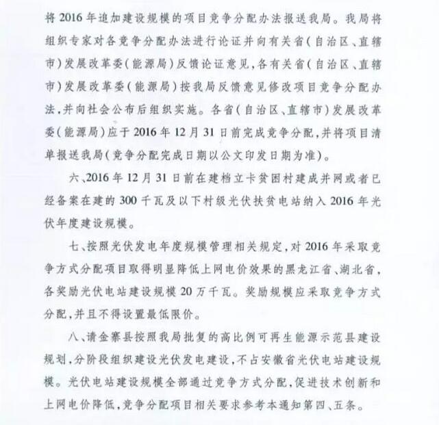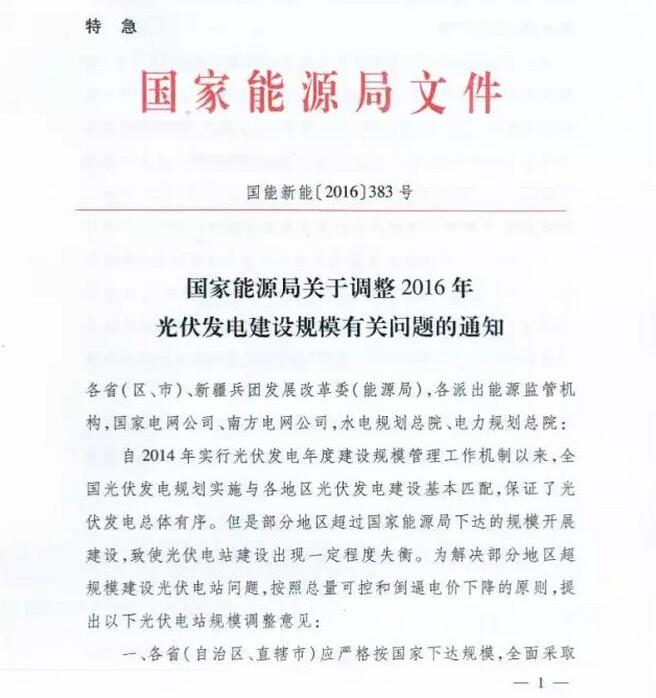 國家能源局關于調整2016年光伏發電建設規模有關問題的通知