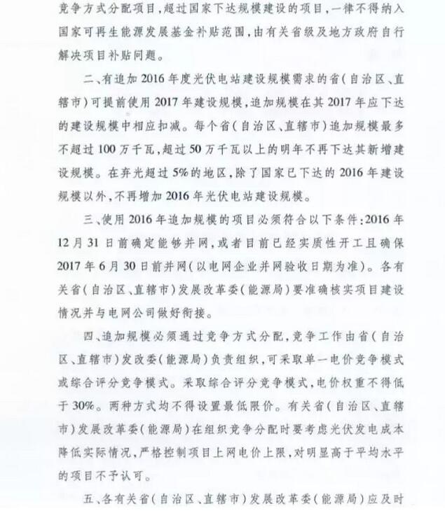 日前,國家能源局下發《關于調整2016年光伏發電建設規模有關問題的通知》,(以下簡稱通知),通知稱目前部分地區超過國家能源局下達規模開展建設光伏項目,導致一定程度失衡。為解決部分地區超規模建設光伏電站問題,按照總量可控和倒逼電價下降原則,全面采取競爭分配項目,超過規模建設,一律不得納入國家補貼,有關地方政府自行解決補貼問題。有追加2016年度指標的地區,可提前使用,并從2017年指標中扣除。
