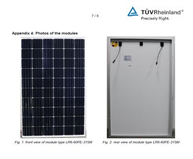 近日,隆基股份成員企業(yè)樂葉光伏收到“LR6-60PE-315M”型單晶組件通過TÜV萊茵的測試報告,報告顯示:基于60片P型PERC單晶156*156mm電池組件,在標(biāo)準(zhǔn)測試條件(STC)下的組件功率達到316.6W,功率刷新行業(yè)新高。據(jù)了解,測試數(shù)據(jù)是TÜV系統(tǒng)目前所測得的該型號最高功率。