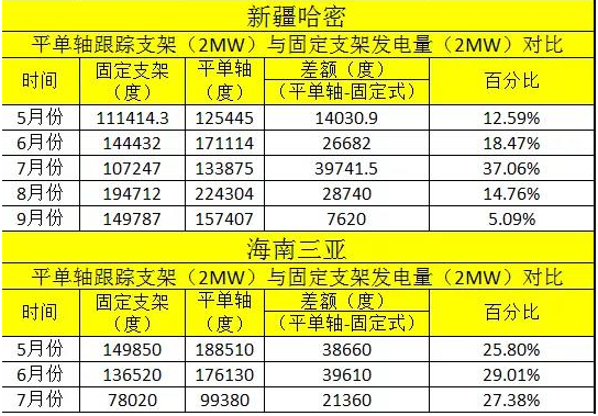 平單軸追蹤系統(tǒng)能有效提升發(fā)電量,通過理論測(cè)算及實(shí)測(cè)數(shù)據(jù)對(duì)比分析可知,對(duì)于提高項(xiàng)目收益率,縮短投資回報(bào)周期效果明顯。以下為新疆哈密和海南三亞某電站的實(shí)測(cè)數(shù)據(jù),對(duì)比可見平單軸追蹤系統(tǒng)比固定支架發(fā)電量有非常明顯的提升。