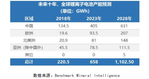 根據數據研究機構Benchmark Mineral Intelligence預測,未來十年,全球鋰電池產能將增加399%,并進入1TWh時代。其中,中國將成為全球鋰電池產業的重鎮,2028年,中國的鋰電池產能將達到631GWh,占全球的57.2%。