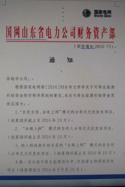 比如,之前小編報道的河北省石家莊400余戶光伏業(yè)主剛剛一次性拿到拖欠的補貼,這廂國網(wǎng)山東就下達通知:下發(fā)可再生能源補貼資金。文件圖片如下: