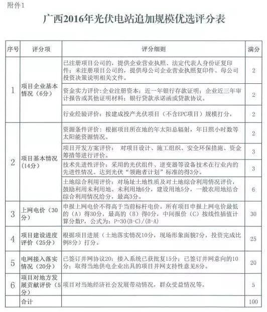 單個(gè)項(xiàng)目得分=基準(zhǔn)電價(jià)/企業(yè)承諾的項(xiàng)目上網(wǎng)電價(jià)×50分+項(xiàng)目建設(shè)進(jìn)度得分+加分。