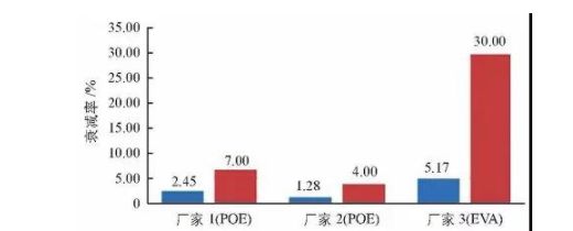 2) 同一種封裝材料, 其背面衰減率明顯高于正面。使用POE封裝的光伏組件其背面衰減率也高達4%~7%,而使用EVA封裝的光伏組件背面衰減率更是高達30%。