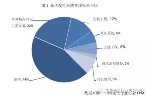 光伏發電系統投資主要由組件、逆變器、支架、電纜等主要設備及材料,升壓系統,通訊監控設備,土建、安裝工程,以及項目設計費、監理費、并網檢測、工程驗收以及前期相關費用等部分構成。其中組件為光伏發電系統的主要設備,一般約占整個系統總投資的40%以上。分布式電站相較地面電站而言,由于在土建工作量、支架用鋼量以及并網設備成本方面較為節約,每瓦投資成本比地面電站低0.5元左右,但部分項目如需對廠房屋頂進行加固,成本也會相應提高。