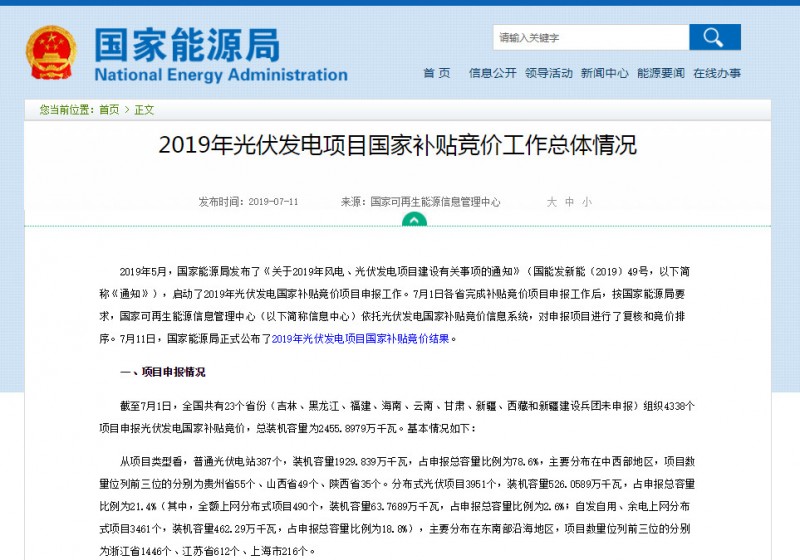 剛剛,國家能源局正式公布了2019年光伏發電項目國家補貼競價結果!