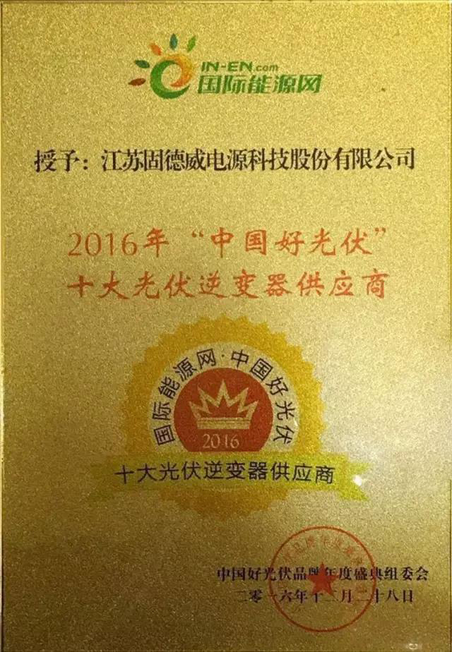 在過去的日子里,固德威依托技術研發,碩果累累,先后榮獲政府列名“高新技術企業”、“省工程技術中心”、“省博士后創新基站”、“省研究生工作站”、光能雜志“中國十佳逆變器企業”、北極星“中國十佳逆變器品牌”、“中國十大逆變器品牌”、“SNEC兆瓦級金獎”、及“蘇州市科學技術局光伏并網逆變器研究中心”等榮譽稱號。