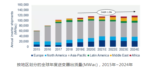 預計隨著市場的變化,從2019年到2024年,集中式逆變器和三相逆變器的任何產(chǎn)品類型收入都將下降最多。而微型逆變器,單相組串式逆變器,直流優(yōu)化器和混合存儲的逆變器在出貨量方面雖然是小份額市場,但市場會有所增長。
