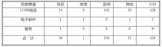 按反映渠道分類,12398電話426件,電子郵件3件,留言9件。(2019年7月收到有效信息情況見表一)