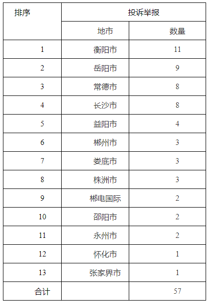 按照投訴舉報數量排序,衡陽市位列轄區第一位,岳陽市位列轄區第二位。(2019年7月投訴舉報排情況見表二)