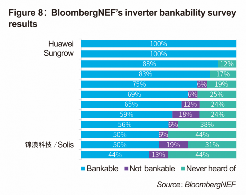 此次BNEF發(fā)布的評(píng)選報(bào)告主要針對(duì)全球知名光伏逆變器制造商的融資價(jià)值展開(kāi)。他們面向全球金融機(jī)構(gòu)(銀行、基金)、項(xiàng)目開(kāi)發(fā)商(EPC)、獨(dú)立電力生產(chǎn)運(yùn)營(yíng)商等光伏行業(yè)利益相關(guān)方發(fā)出問(wèn)卷調(diào)查表,并與質(zhì)量檢測(cè)和技術(shù)專家進(jìn)行深度訪談,調(diào)研范圍覆蓋全球25吉瓦的光伏產(chǎn)品。