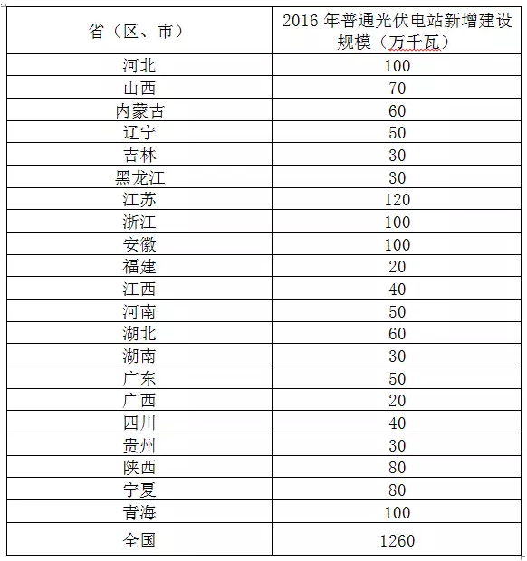 2016年6月3日,國(guó)家能源局正式發(fā)布2016年光伏發(fā)電建設(shè)實(shí)施方案:2016年下達(dá)全國(guó)普通光伏電站項(xiàng)目1260萬千瓦,對(duì)不具備新建光伏電站市場(chǎng)條件的甘肅、新疆、云南停止或暫緩下達(dá)2016年新增光伏電站建設(shè)規(guī)模(光伏扶貧除外);山東普通光伏電站新增建設(shè)規(guī)模全部用于光伏扶貧。