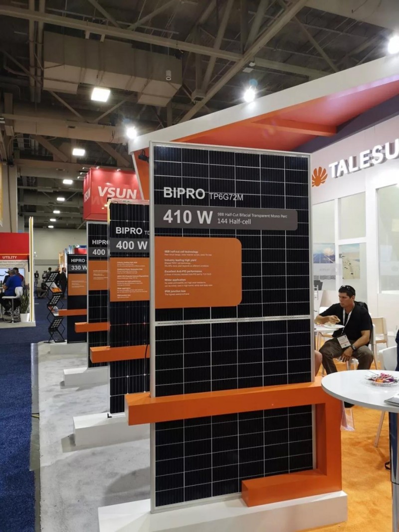 本次展會(huì)騰暉展出了專為美國(guó)市場(chǎng)打造的雙面9BB切半透明組件——BIPRO TP6G72M。該款組件采用158.75mm雙面單晶PERC電池,在此基礎(chǔ)上疊加了電池切半及多主柵生產(chǎn)工藝,大大提高了功率輸出,72片(144片半片)組件單面發(fā)電功率最高達(dá)410 W,雙面綜合輸出功率超過(guò)510 W。該款產(chǎn)品避開了美國(guó)“201政策”,大大降低了進(jìn)口成本,同時(shí)產(chǎn)品本身的特性可以在很大程度上降低度電成本,顯著提高電站系統(tǒng)總體發(fā)電量。目前,騰暉已接到大量來(lái)自美國(guó)對(duì)該產(chǎn)品的訂單。