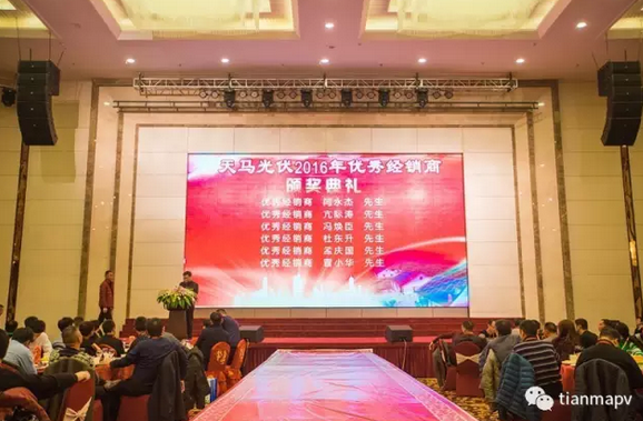 隨后,在頒獎典禮上,分別頒發了“優秀經銷商”及“戰略合作伙伴”獎項。天馬光伏戰略合作伙伴代表——北京首信陽光新能源科技服務有限公司的劉道偉先生、山東永遠集團有限公司的王忠民先生,天馬光伏優秀經銷商代表——揚州夢海光電科技工程有限公司的王靜先生分別發表了講話,這無疑為天馬光伏未來發展打了一支強心劑,現場雷鳴般掌聲接連不斷。