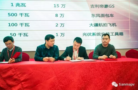 接著,晚宴前,遼寧新電能股份有限公司、吉林省恒光新能源科技有限公司、桑夏太陽能股份有限公司等六家公司進行了簽約儀式,簽約儀式過后便是火爆的現場訂貨會,場面熱烈非凡,佛山市誠電電力工程有限公司、北京圣火寒緣科技發展有限公司、南通北初新能源有限公司等紛紛訂貨,還有很多客戶現場刷卡交付訂金,一直持續到晚上9點多才結束,可以說是收獲滿滿!