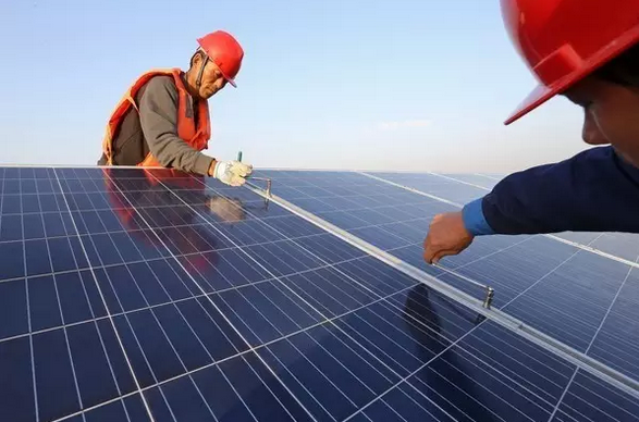 工人在固定的支架上安裝光伏板。