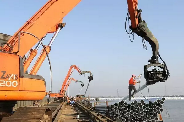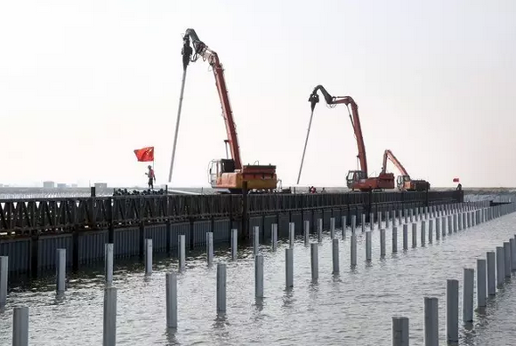 記者在施工現場看到,岸邊,大型吊裝機伸展巨臂進行吊裝作業;水面上,運送材料的船只來往穿梭;水中平臺上,大型打樁機把一根根樁管打入水底……由近及遠,到處是頭戴安全帽、身穿救生衣忙碌的工人。