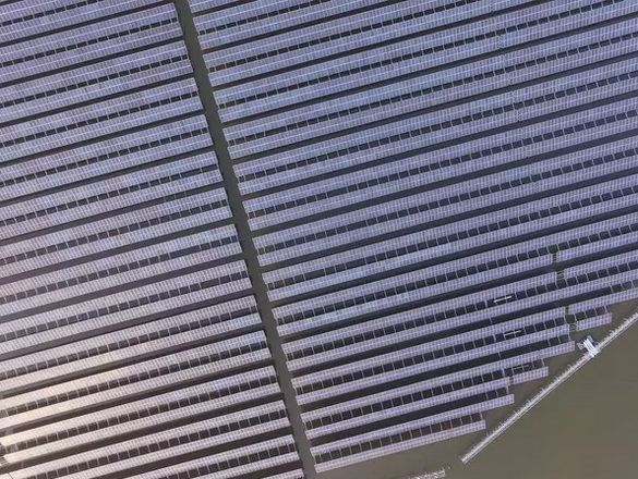 空中鳥瞰水庫上鋪設的光伏陣列。