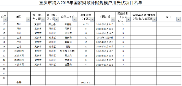 重慶10月共260.1kW戶用項目納入國家補貼規模