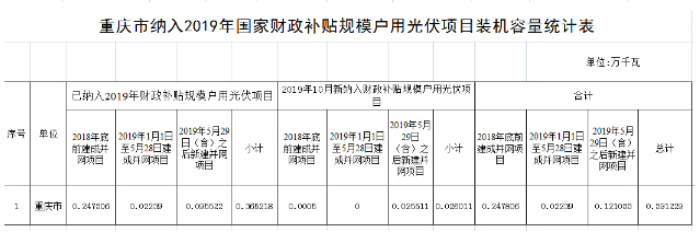 依據重慶市能源局《關于做好2019年度光伏發電項目建設管理有關工作的通知》(渝能源電〔2019〕39號)要求,現對重慶市納入2019年國家財政補貼規模的戶用光伏項目進行公示,具體見附件。