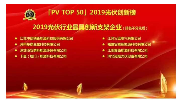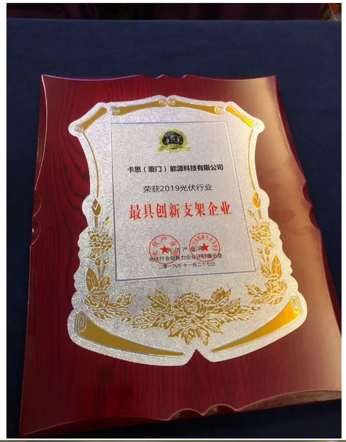 2019年11月27日,「PV TOP 50」2019光伏行業創新力企業50強榜單發布暨頒獎典禮(PV TOP 50光伏創新榜)在蘇州圓滿落下帷幕!卡思能源受邀出席,并榮獲“「PV TOP 50」2019光伏創新榜最具創新支架企業”稱號。此次獲獎是對卡思能源技術創新及產品研發能力的充分肯定。