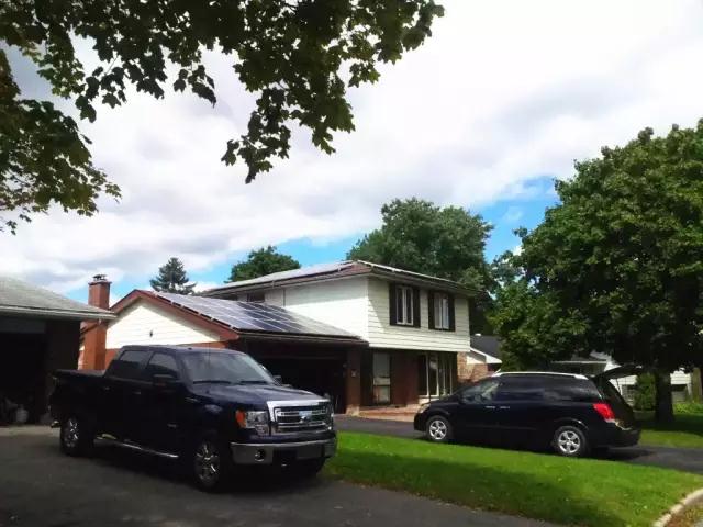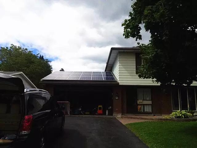 該項目使用兩臺5KW逆變器SolarRiver 5000TLA-US,位于加拿大溫莎市,溫莎是加拿大最南端城市,深深嵌入美國,其電網環境跟美國完全一樣。業主是來自于古巴的移民Santiago,Santiago成功申請了安大略省的micro feed計劃,該計劃鼓勵普通家庭使用自己的屋頂來進行光伏發電,安大略省供電局將高于市場價來收取上網的光伏發電,該項目限制每戶安裝量不能超過10KW。由于補貼挺高,Santiago最大化安裝了10KW板子,由于屋頂朝向比較復雜,選用了兩臺5KW組串逆變器,擁有4路MPPT。安裝圖如下: