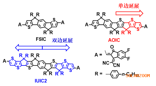 單邊延展及雙邊延展分子設計示意圖以及稠環電子受體分子結構
