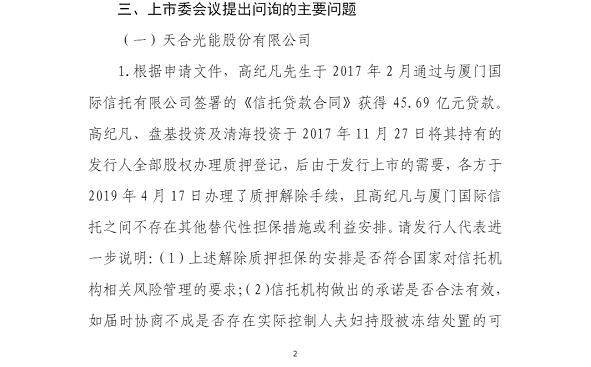 三、上市委會議提出問詢的主要問題(一)天合光能股份有限公司1.根據申請文件,高紀凡先生于 2017 年 2 月通過與廈門國 際信托有限公司簽署的《信托貸款合同》獲得 45.69 億元貸款。高紀凡、盤基投資及清海投資于 2017 年 11 月 27 日將其持有的 發行人全部股權辦理質押登記,后由于發行上市的需要,各方于 2019 年 4 月 17 日辦理了質押解除手續,且高紀凡與廈門國際信 托之間不存在其他替代性擔保措施或利益安排。請發行人代表進 一步說明:(1)上述解除質押擔保的安排是否符合國家對信托機 構相關風險管理的要求;(2)信托機構做出的承諾是否合法有效, 如屆時協商不成是否存在實際控制人夫婦持股被凍結處置的可能性,如何保證對實際控制人的控股權不產生不利影響;(3)《信 托貸款合同》是否約定實際控制人在發生諸如違反借款用途等情 況下負有提前還款的責任;如存在,請說明如何保證其控股權不 受影響;(4)實際控制人的還款計劃及相關措施的可靠性。請保 薦代表人發表明確意見。