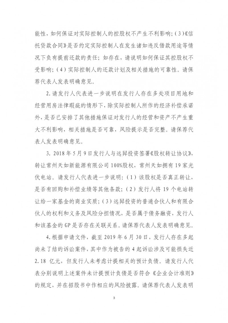 3. 2018 年 5 月 9 日發行人與遠昇投資簽署《股權轉讓協議》, 轉讓常州天如新能源有限公司 100%股權,常州天如擁有 19 家光 伏電站。請發行人代表進一步說明:(1)該股權是否真正轉讓, 是否有回購和補償業績等其他條款;(2)發行人將 19 個電站轉 讓給一家基金的商業實質;(3)遠昇投資的普通合伙人和有限合 伙人的權利和義務及風險分擔情況,是否屬于債務融資,發行人 和該基金的 GP 是否存在關聯關系。請保薦代表人發表明確意見。