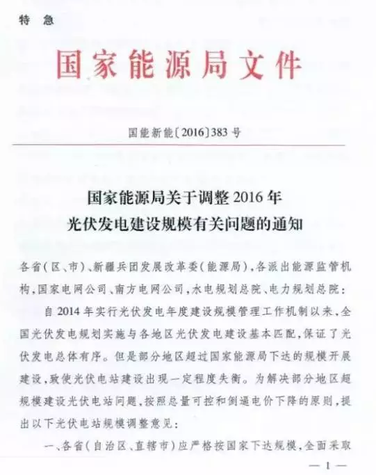 緊隨其后的是國家能源局發(fā)布了《國家能源局關(guān)于調(diào)整2016年光伏發(fā)電建設(shè)規(guī)模有關(guān)問題的通知》(國能新能【2016】383號)特急文件。糾正光伏行業(yè)存在的“限電”、“補(bǔ)貼拖延”以及光伏企業(yè)、金融機(jī)構(gòu)在風(fēng)控等方面的混亂局面。