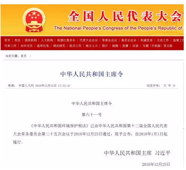 全民君第一時(shí)間報(bào)道了環(huán)保稅的新聞:習(xí)近平簽發(fā)中華人民共和國第六十一號主席令:《中華人民共和國環(huán)境保護(hù)稅法》已由中華人民共和國第十二屆全國人民代表大會常務(wù)委員會第二十五次會議于2016年12月25日通過,自2018年1月1日起施行。