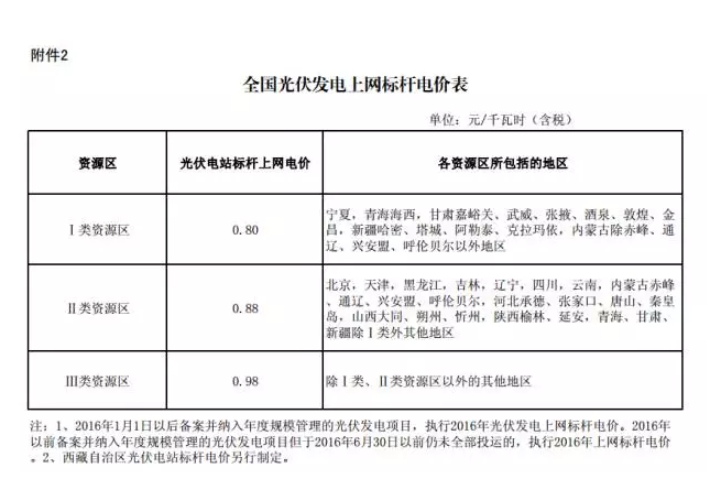 光伏標(biāo)桿上網(wǎng)電價(jià)I類區(qū)域?yàn)?.65元/千瓦時(shí),II類區(qū)域?yàn)?.75元/千瓦時(shí),III類區(qū)域?yàn)?.85元/千瓦時(shí)。分布式光伏度電補(bǔ)貼價(jià)格在本文件中并未被提及,按照發(fā)改委2015年12月22日發(fā)布的《國家發(fā)展改革委關(guān)于調(diào)整光伏發(fā)電陸上風(fēng)電報(bào)告上網(wǎng)電價(jià)的通知》的理解,分布式光伏電價(jià)補(bǔ)貼將維持在0.42元/千瓦時(shí)不變。