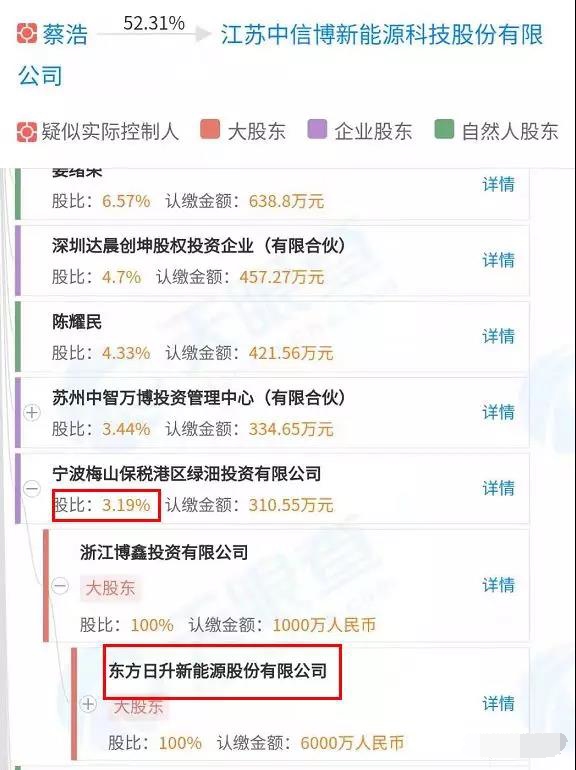 天眼查信息顯示,2017年4月,上市公司東方日升通過全資子公司博鑫投資的子公司綠沺投資參與中信博增資,截至2020年1月,綠沺投資為中信博第七大股東,持股數310.55萬股,持股比例3.19%。