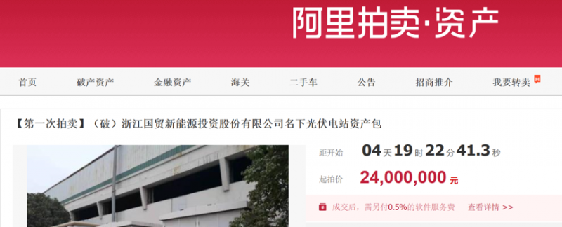從阿里司法拍賣平臺上獲悉,浙江國貿新能源投資股份有限公司名下光伏電站資產包將在2月10日,起拍價2400萬元,加價幅度為5萬元。