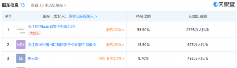 從天眼查查詢浙江省國興進出口有限公司股東信息,浙江省國際貿易集團有限公司持股比例55.9%,為大股東。