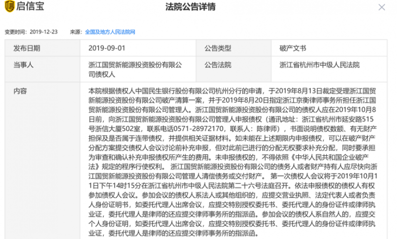 人民法院公告網站顯示,2019年9月杭州市中級人民法院發布破產文書公告,杭州市中級法院于2019年8月13日裁定受理浙江國貿新能源投資股份有限公司破產清算一案,并于2019年8月20日指定浙江京衡律師事務所擔任浙江國貿新能源投資股份有限公司管理人。