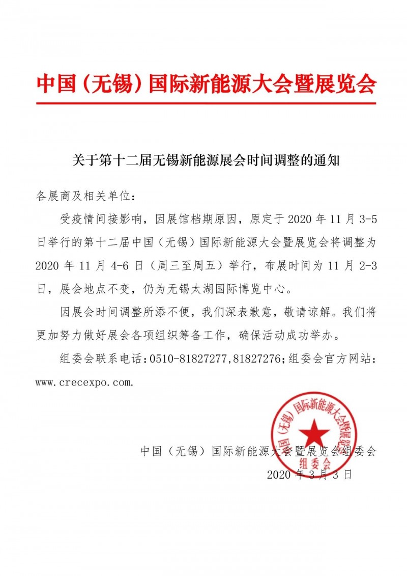 受疫情間接影響,因展館檔期原因,原定于2020年11月3-5日舉行的第十二屆中國(無錫)國際新能源大會暨展覽會將調整為2020年11月4-6日(周三至周五)舉行,布展時間為11月2-3日,展會地點不變,仍為無錫太湖國際博覽中心。